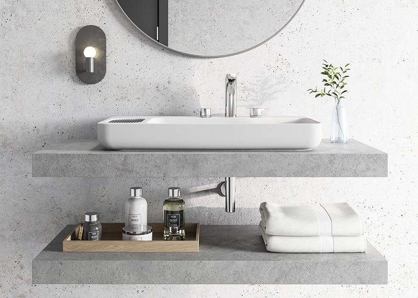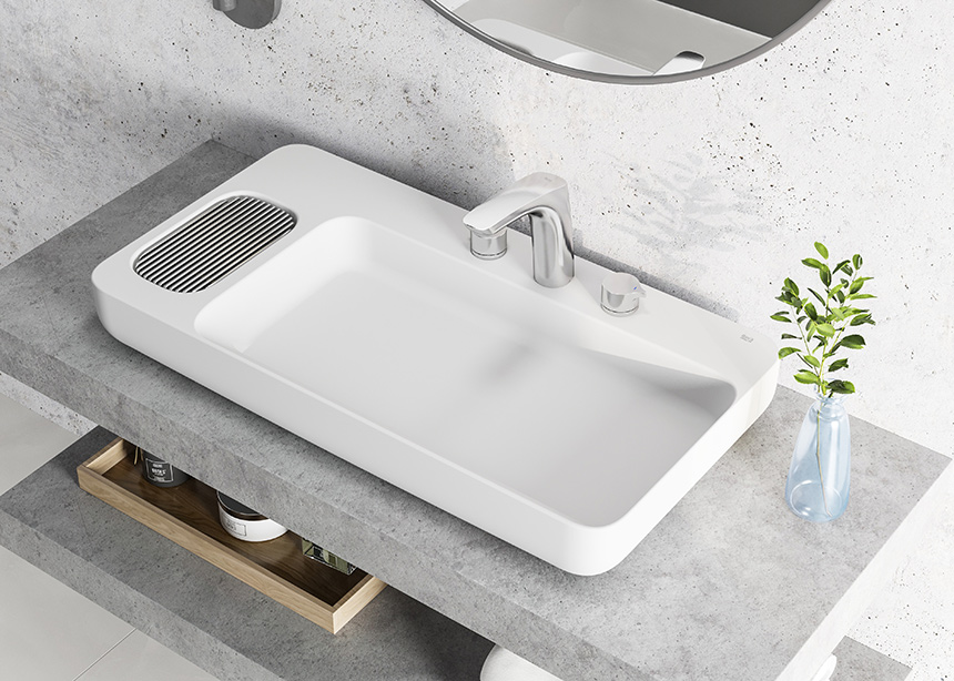 Forma e função unidas para oferecer a melhor experiência possível ao usuário em termos de conforto: uma área de lavatório generosa, grande espaço para colocar objetos (sabão e itens pessoais) e um equilíbrio meticuloso de tecnologia, formas e materiais.