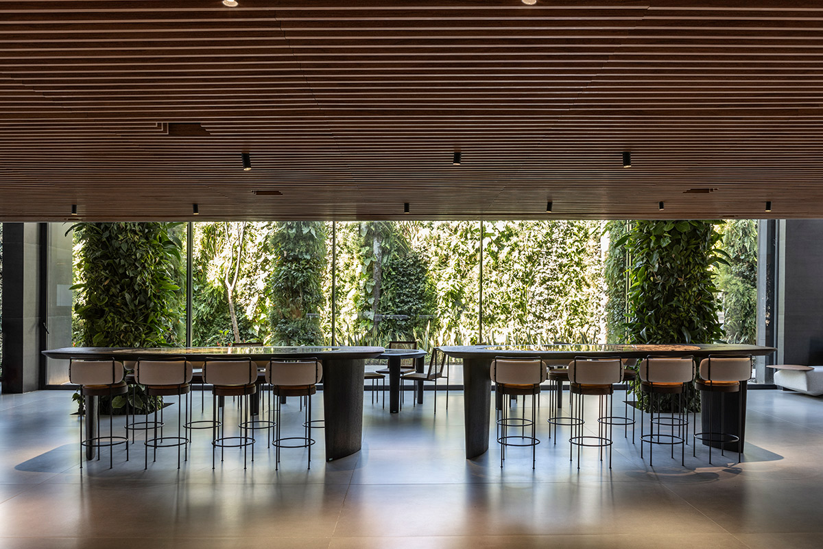 A mistura de elementos vegetativos, madeira e vidro dão o tom do projeto. Assim, a natureza é a protagonista do espaço, um edifício de vidro inspirado na Mata Atlântica, que utiliza matérias-primas sustentáveis, como a madeira de reflorestamento. Um verdadeiro convite à descompressão em meio ao movimento da maior metrópole da América Latina, o local transmite a brasilidade e a modernidade global em sua essência.