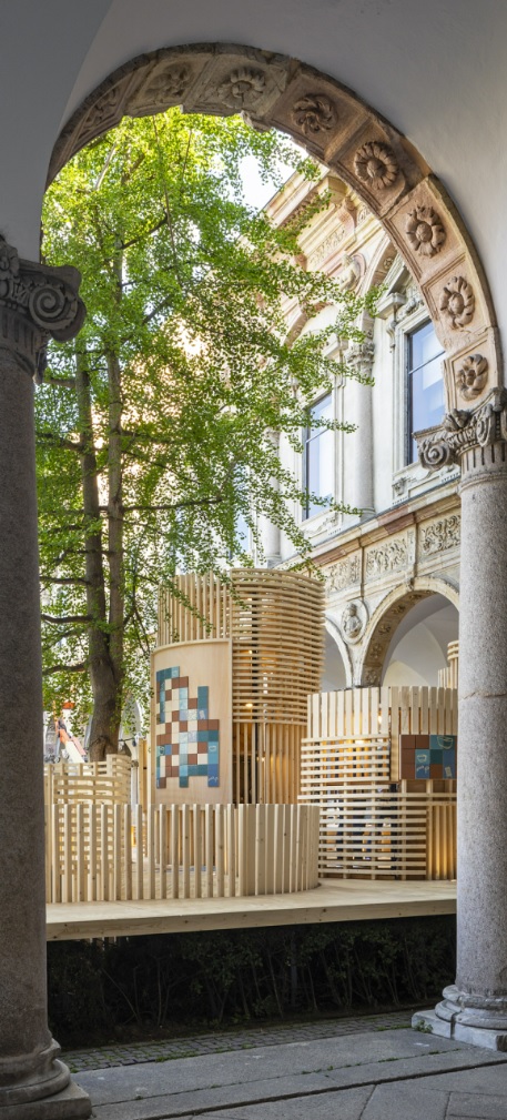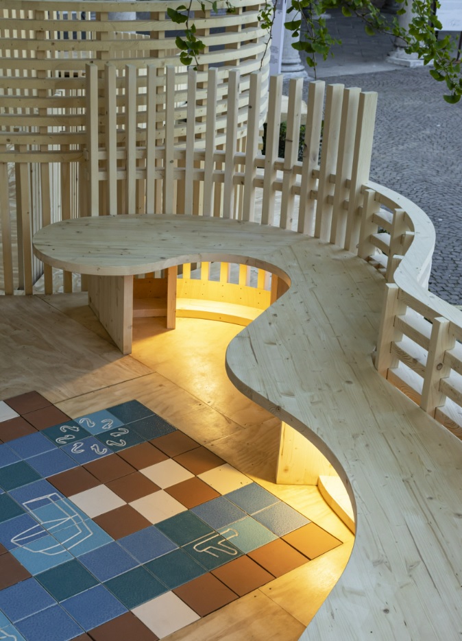 A seleção de cores para as cerâmicas traz desenhos alegóricos dos produtos Nu e Tura. Seguindo o projeto de Benedetta Tagliabue – EMBT Architects, a Ceràmica Cumella, em colaboração com o Instituto de Arquitetura IAAC (Instituto de Arquitectura Avanzada de Cataluña), combina o artesanato tradicional com a tecnologia.