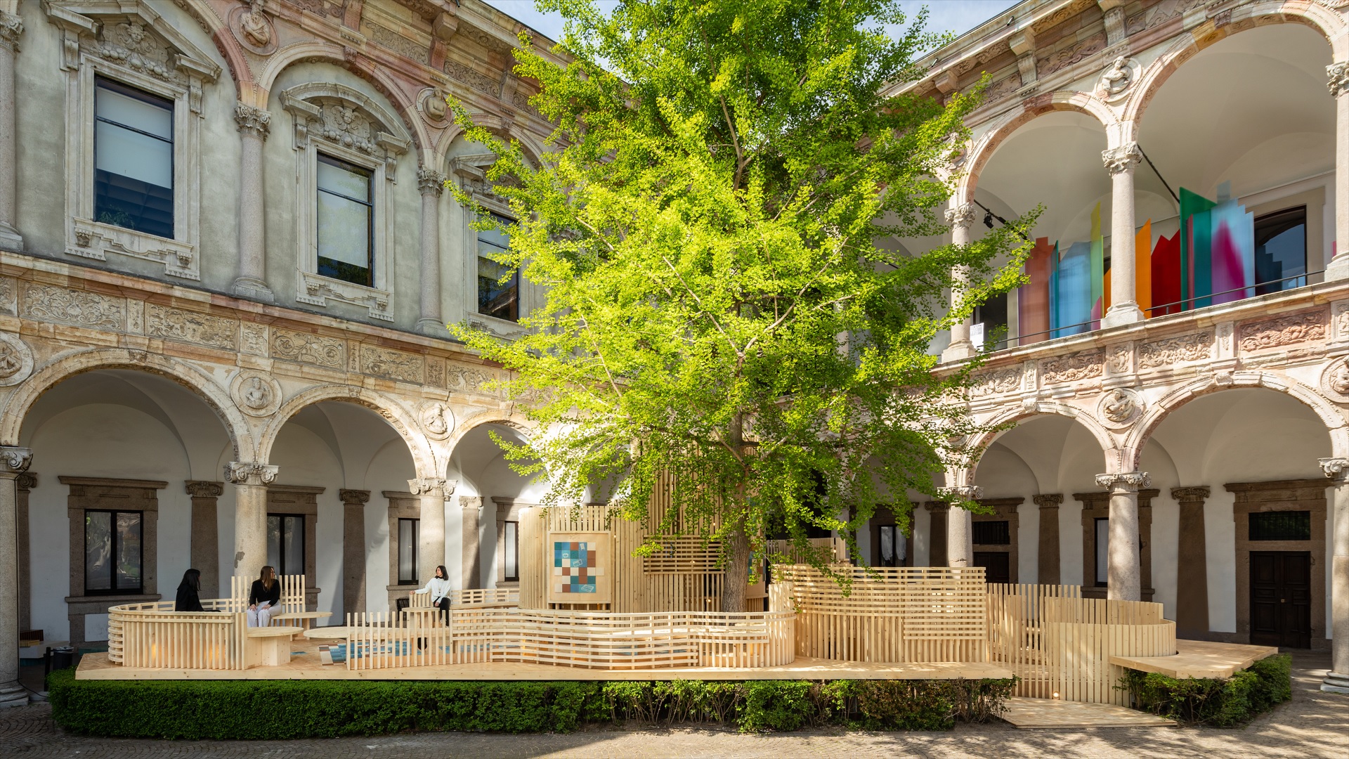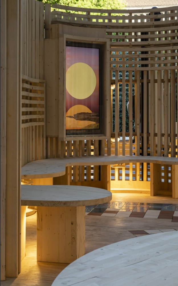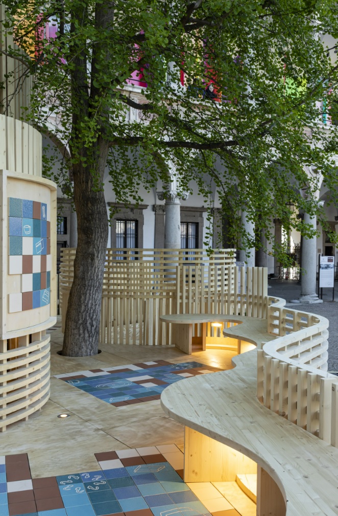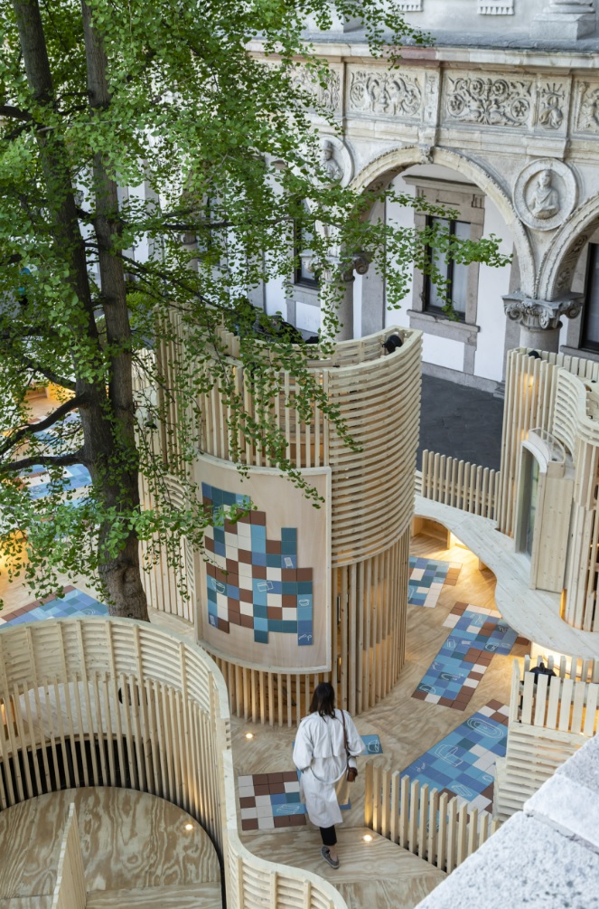 As formas orgânicas e a combinação de cores neutras, desde os diferentes tons de marrom aos vários tons de azul, remetem para a terra e para o mar. “Ecos do Mediterrâneo”, diz Benedetta Tagliabue, “elementos da natureza com os quais os visitantes interagem lentamente”.