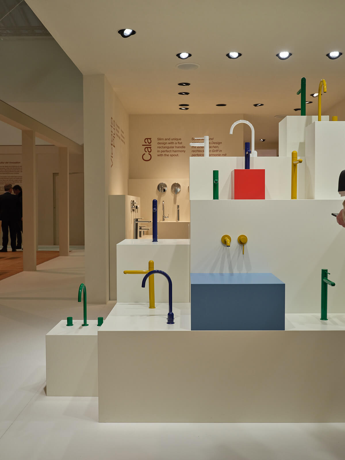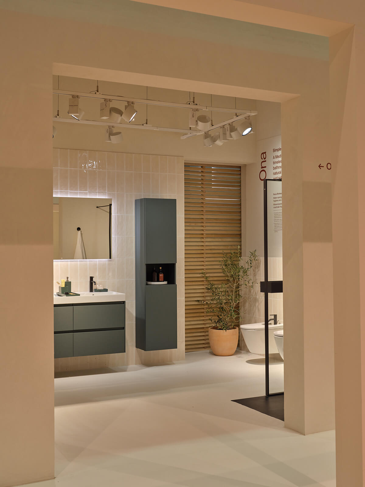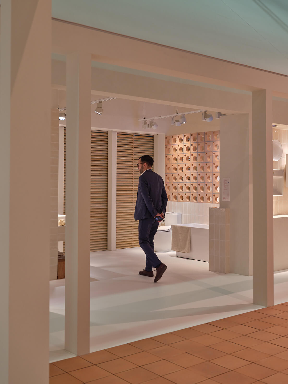 Mesura se ha inspirado en el trabajo de algunos de los grandes arquitectos de la Barcelona de mitad del siglo XX y en su forma de utilizar la luz y los materiales más sencillos para lograr gestos arquitectónicos poderosos. Las nuevas colecciones e innovaciones de Roca se exponen en torno a un patio central, que recuerda a la típica "plaza", donde los visitantes pueden reunirse e interactuar. Las contraventanas, también esenciales en la arquitectura mediterránea, desempeñan un papel importante en el diseño del stand. Dispuestas de tal manera que desde el exterior permiten vislumbrar el producto albergado en el stand, estas contraventanas crean un ambiente íntimo en el interior en el que destaca el juego de luces generado.