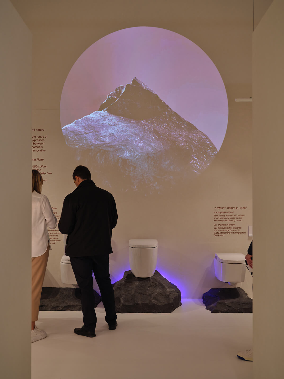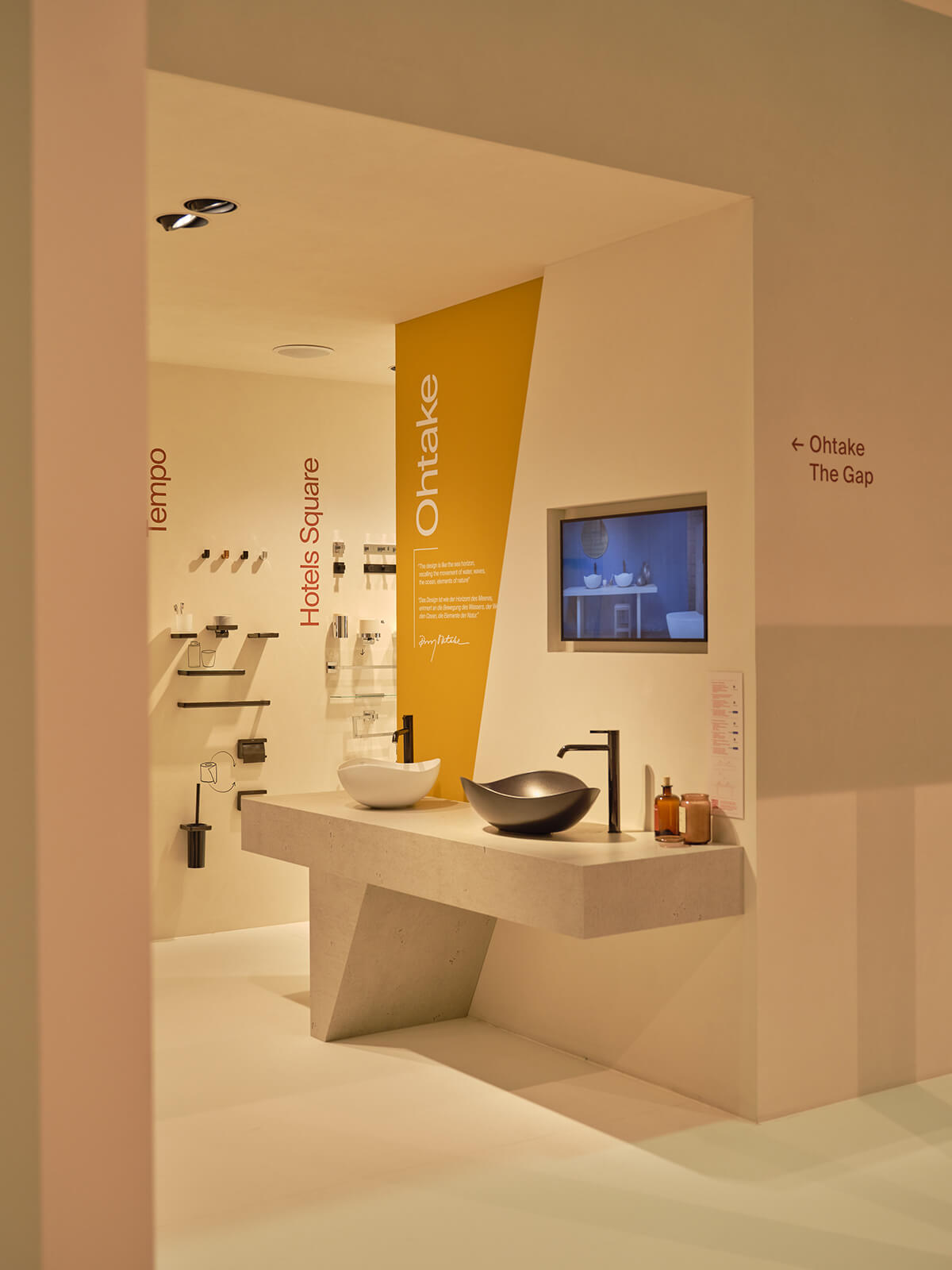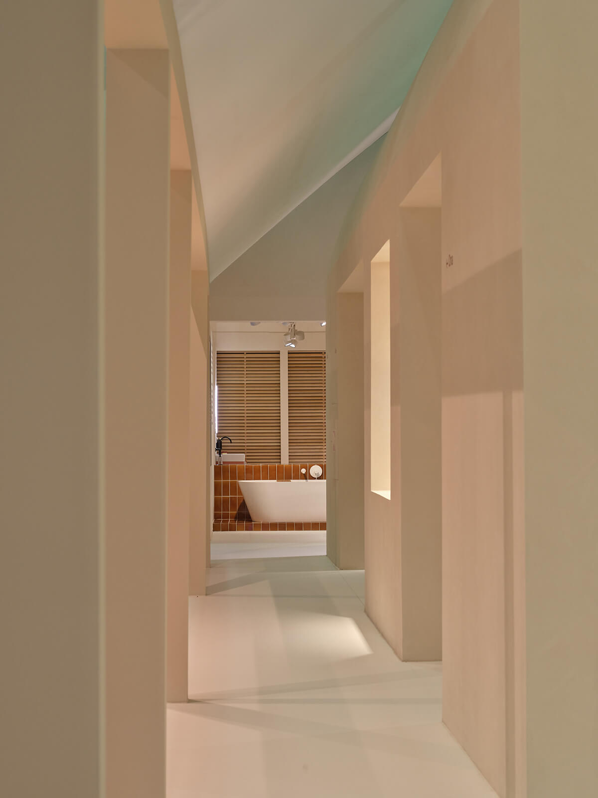 Mesura se ha inspirado en el trabajo de algunos de los grandes arquitectos de la Barcelona de mitad del siglo XX y en su forma de utilizar la luz y los materiales más sencillos para lograr gestos arquitectónicos poderosos. Las nuevas colecciones e innovaciones de Roca se exponen en torno a un patio central, que recuerda a la típica "plaza", donde los visitantes pueden reunirse e interactuar. Las contraventanas, también esenciales en la arquitectura mediterránea, desempeñan un papel importante en el diseño del stand. Dispuestas de tal manera que desde el exterior permiten vislumbrar el producto albergado en el stand, estas contraventanas crean un ambiente íntimo en el interior en el que destaca el juego de luces generado.