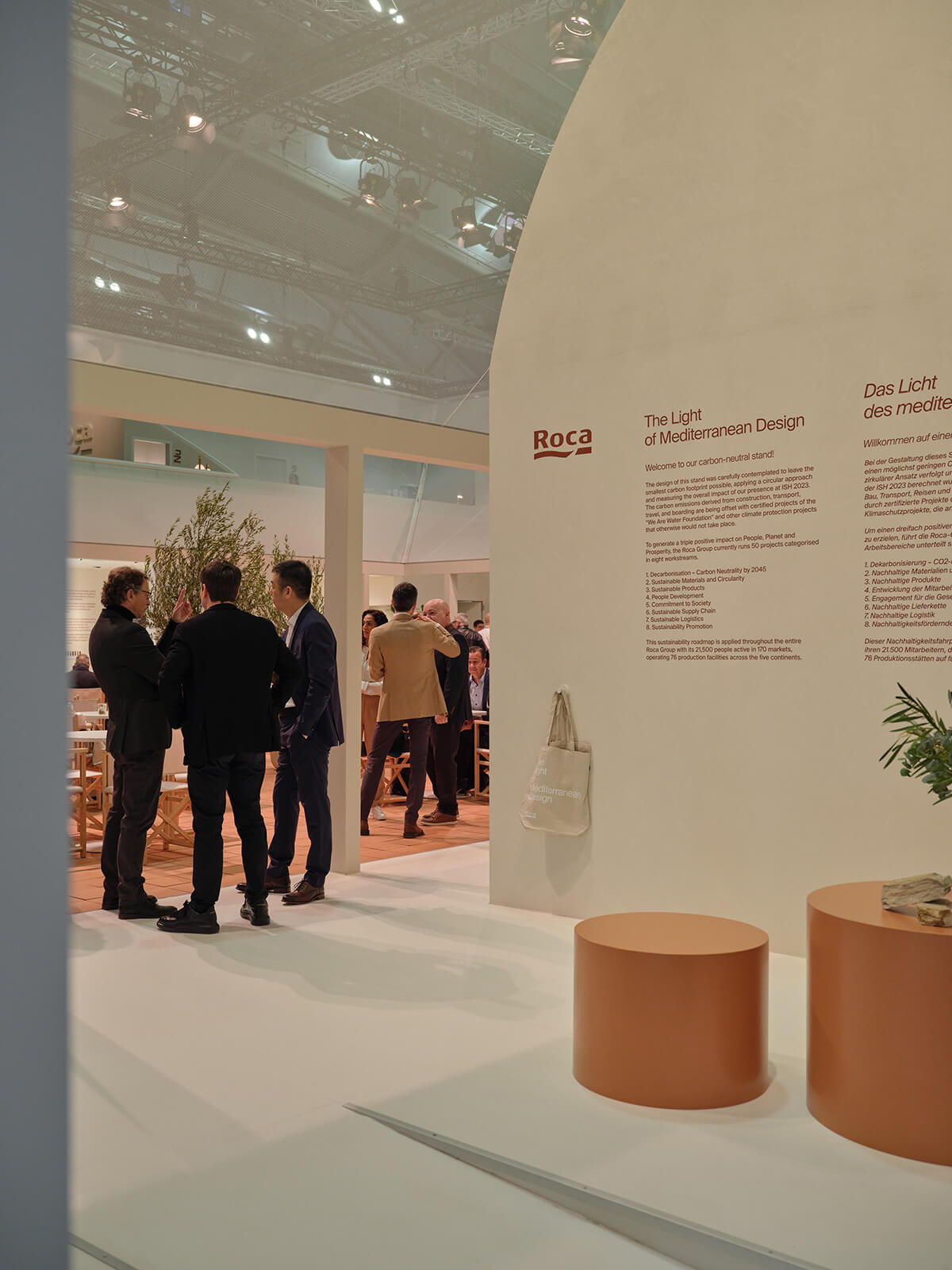 Para esta primera edición de la feria ISH tras la pandemia, Roca ha colaborado con el estudio Mesura en el diseño de un stand inspirado en la luz y la arquitectura del Mediterráneo. De esta manera el estudio de arquitectura de Barcelona ha asumido el reto de reflejar tanto los valores de la compañía, como su liderazgo industrial y sus orígenes mediterráneos, mostrando en su espacio las nuevas soluciones para el baño.