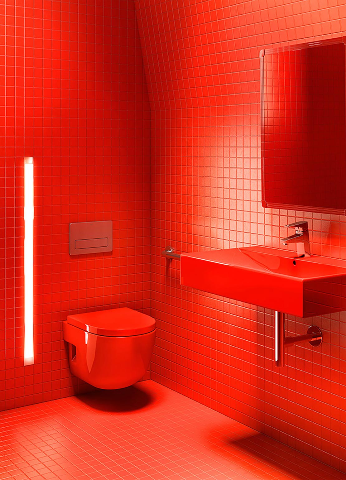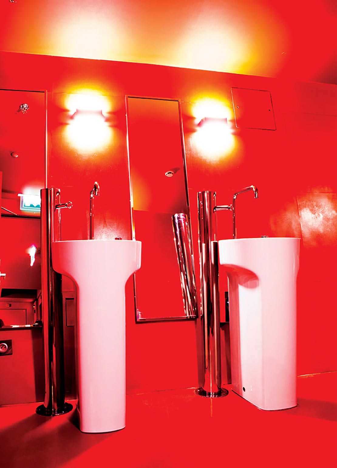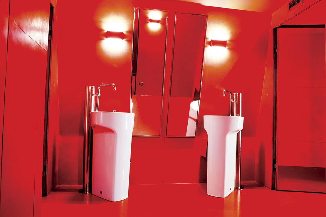 Concebido para uso privado, o pavilhão Eiffel, no primeiro andar, conta com uma sala de conferências com capacidade para 300 pessoas e foi o primeiro espaço da torre a ser equipado com a gama completa de produtos Roca – das louças aos metais, passando pelos sistemas de instalação e placas de acionamento. Numa área com paredes pintadas em vermelho “veneziano” brilhante, o branco das louças e dos lavatórios Roca contrasta com esse tom forte, outrora o original em toda a torre. Inspirado nesta informação, para muitos visitantes desconhecida, o arquiteto responsável pelo projeto, Alain Moatti, optou pelo lavatório Amberes e pela bacia Meridian na sua versão suspensa para criar contraste entre linhas curvas e retas, prestando a sua homenagem pessoal num diálogo entre o vermelho e o branco.
