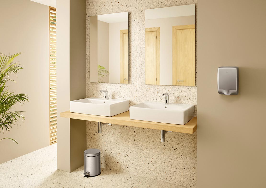 A Roca oferece uma linha de torneiras eletrônicas que podem ser facilmente instaladas em banheiros. Você pode optar por uma versão ligada à rede elétrica (modelos bivolt, 110v/220v) ou escolher um modelo que funcione com pilhas (AA). Neste caso você não precisará de uma tomada perto da cuba para desfrutar de todos os benefícios desta tecnologia com total conforto. Se você escolher a versão com pilhas, você não terá que se preocupar com elas se esgotando de repente, porque uma luz piscando no visor inferior da torneira lhe dirá que é hora de substituí-las.