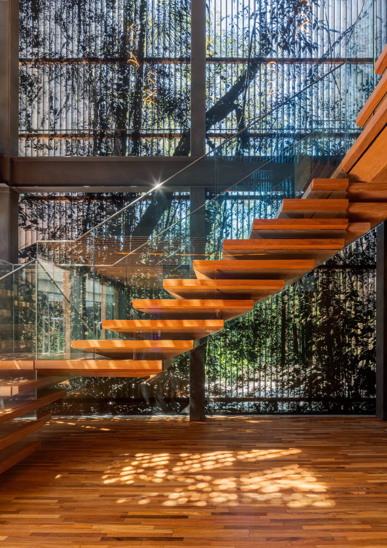 A intenção de utilizar elementos ligados a natureza é de transportar a atmosfera da mata para as áreas internas do projeto, como a madeira e pedra, que proporcionam a sensação de atemporalidade e durabilidade.